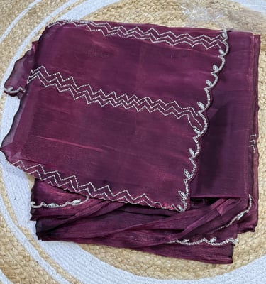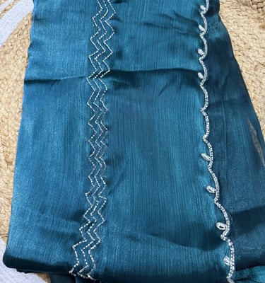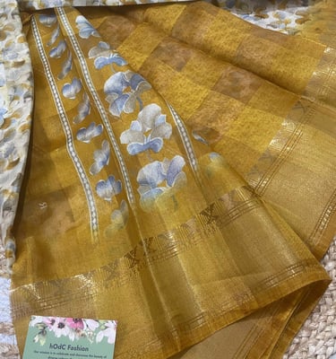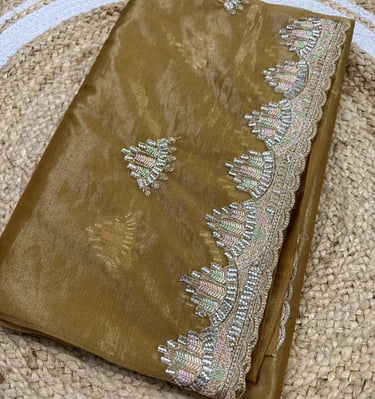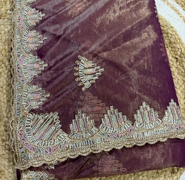 The lightweight tissue fabric offers a subtle metallic sheen, while hand embroidery adds soulful detailing with threads, beads, sequins, or zari.
