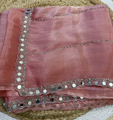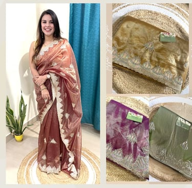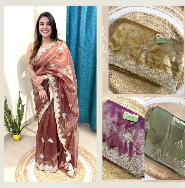These sarees feature a distinctive crushed effect that adds depth and drama, while the tissue fabric lends a subtle shimmer and airy drape.